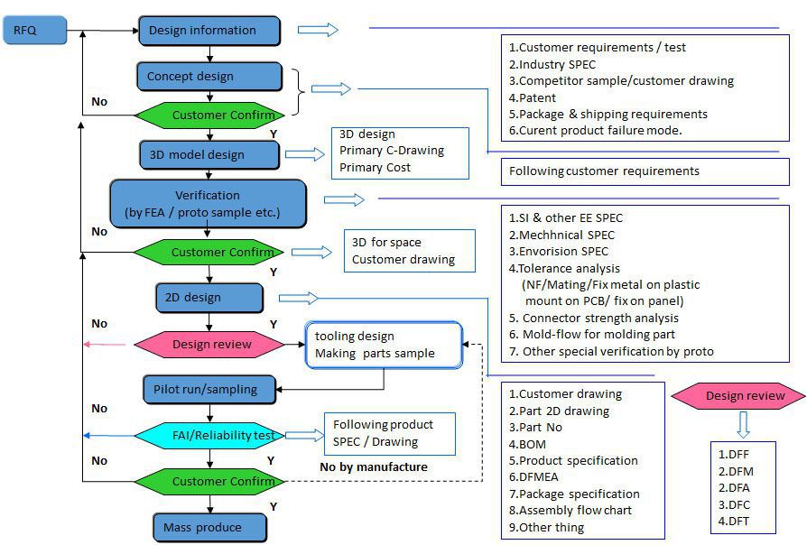 為保證產(chǎn)品開發(fā)的時(shí)效,品質(zhì),公司建立了完善的產(chǎn)品開發(fā)流程,使產(chǎn)品從設(shè)計(jì)導(dǎo)入開始,到產(chǎn)品設(shè)計(jì)驗(yàn)證完成量產(chǎn)的整個(gè)過程都處于掌控之中,從而為滿足客戶產(chǎn)品性能要求,降低產(chǎn)品制造成本,保證產(chǎn)品制造質(zhì)量,縮短產(chǎn)品開發(fā)周期,奠定了必要的流程基礎(chǔ)。