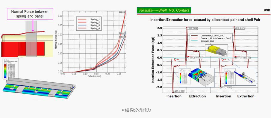 公司具備連接器研發(fā)之CAE工程分析能力, 如結(jié)構(gòu)分析,模流分析,信號(hào)完整性分析,熱分析等。在產(chǎn)品的研發(fā)過程中,即可確定產(chǎn)品的性能,產(chǎn)品的制造性等。從而節(jié)約產(chǎn)品研發(fā)成本,縮短產(chǎn)品研發(fā)周期,提高產(chǎn)品設(shè)計(jì)質(zhì)量。